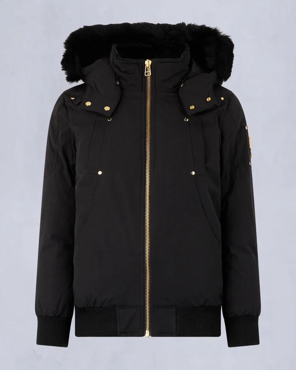 This version of the Unisex Gold Bomber features classic Moose Knuckles details like the iconic J-seam chest pockets, a removable lamb shearling-trimmed hood, an