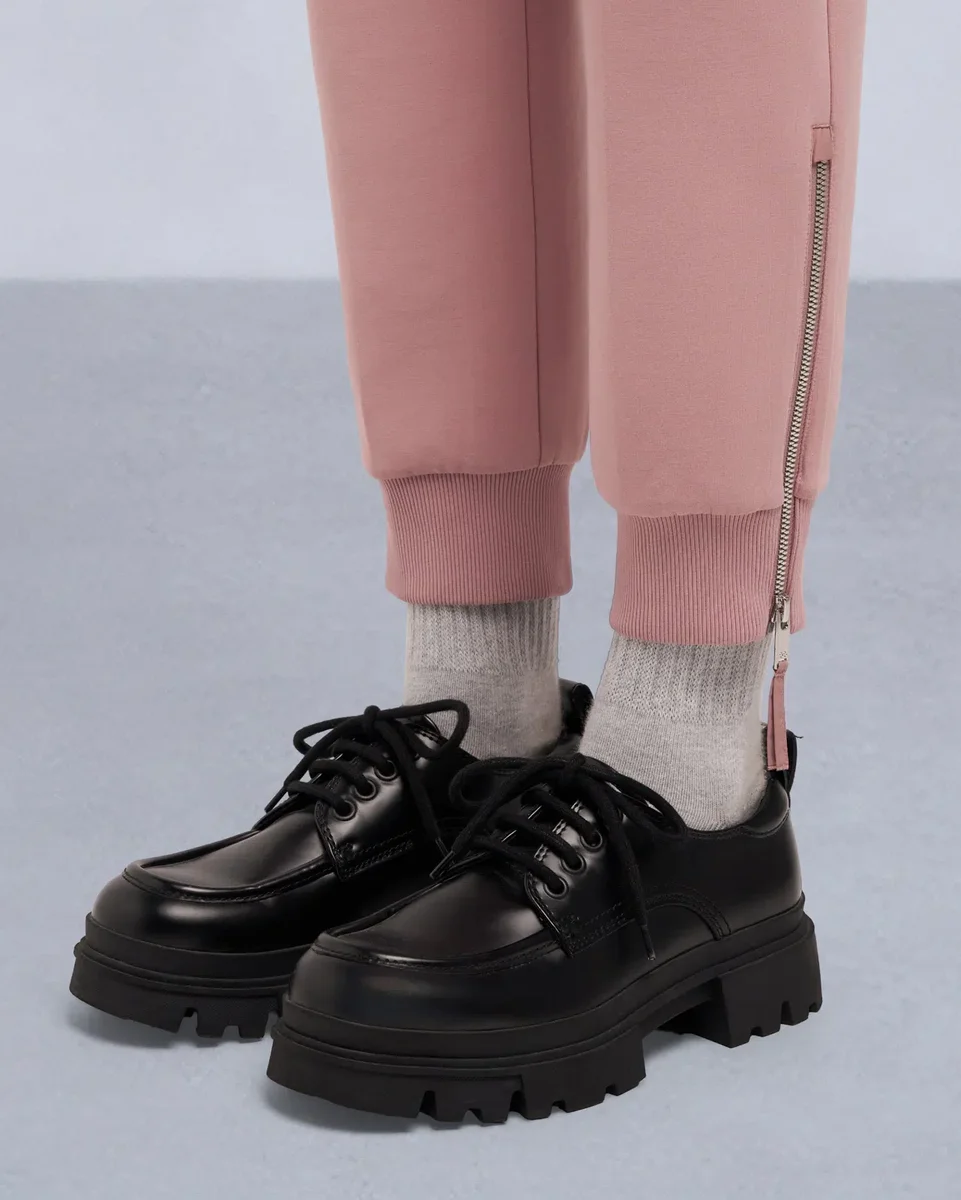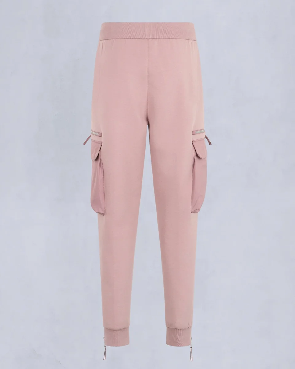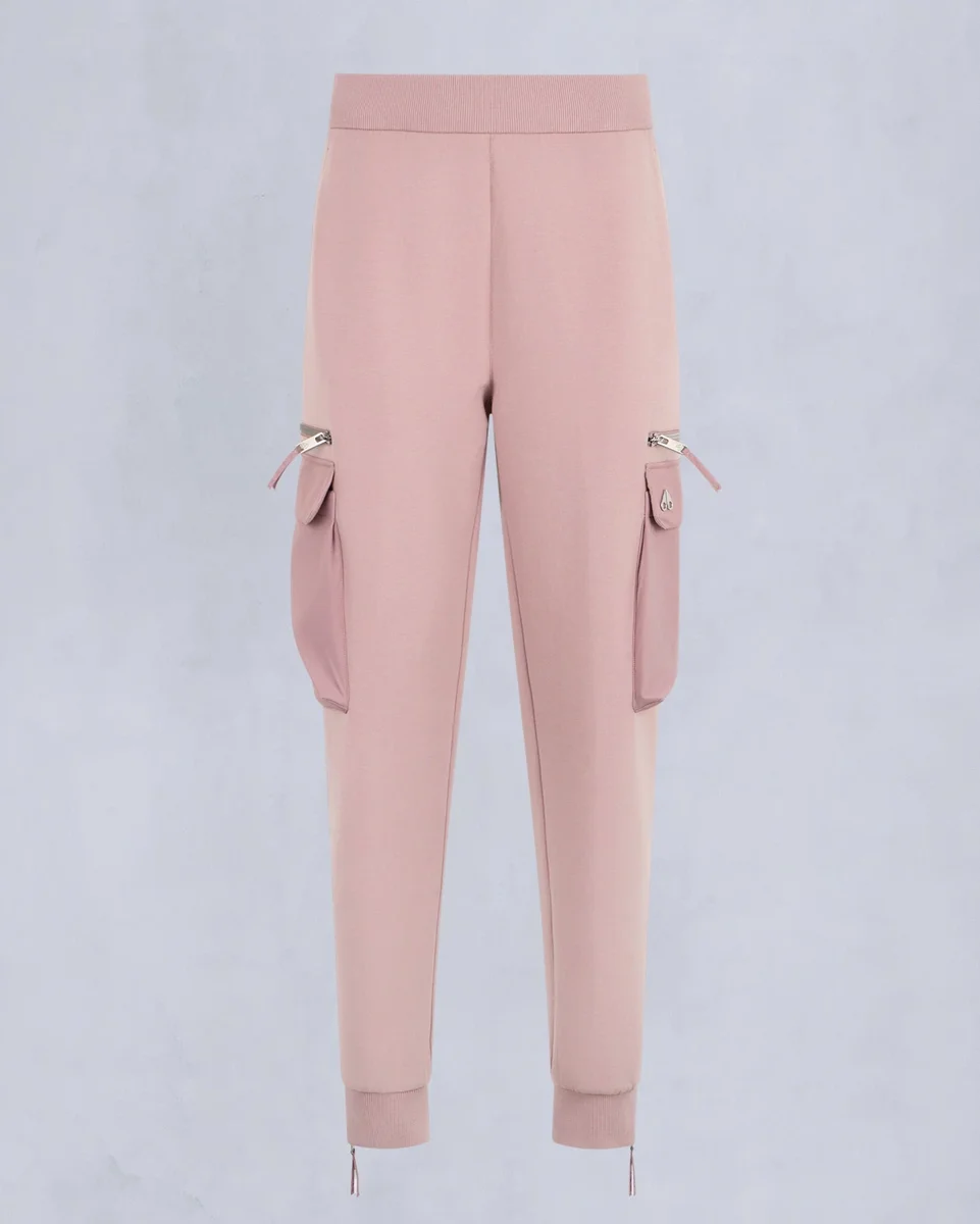 • Rib Knit Waistband with Drawstring on Interior, Rib Knit Cuffs, and Zipper Opening at Pant Leg